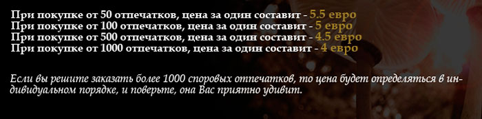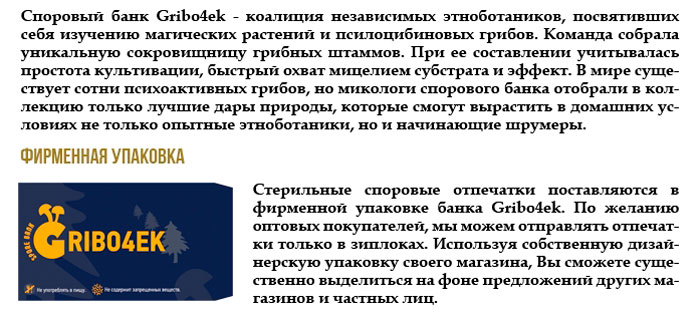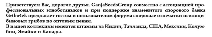 GanjaSeedsGroup совместно со споровым банком Gribo4ek предлагают споры галлюциногенных грибов по оптовым ценам. Кроме колоссальных скидок на отпечатки грибов, вас ждут и подарки. Станьте партнером и получите возможность экономить на покупках или заработать на продажах.