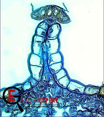 Соединенные с листом, либо прилистником при поддержке клеток черенка (красный) и клеток основы (зеленых), дисковые клетки акцентируют в секреторную полость межклеточный элемент, предназначается для поддержания оболочки надкожицы в течение увеличения полости.